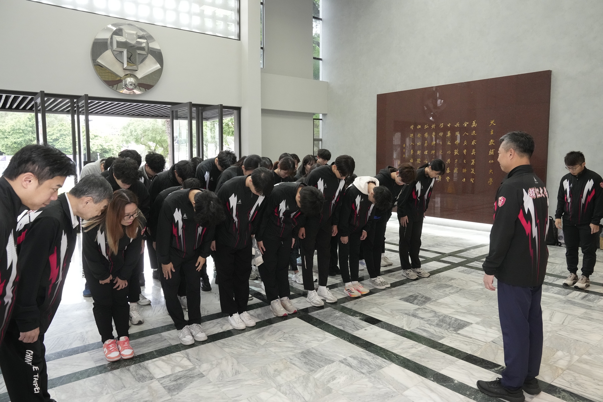 ▲藍校長歡送跆拳道隊離開,全體師生於于斌樓一樓誠摯感謝。