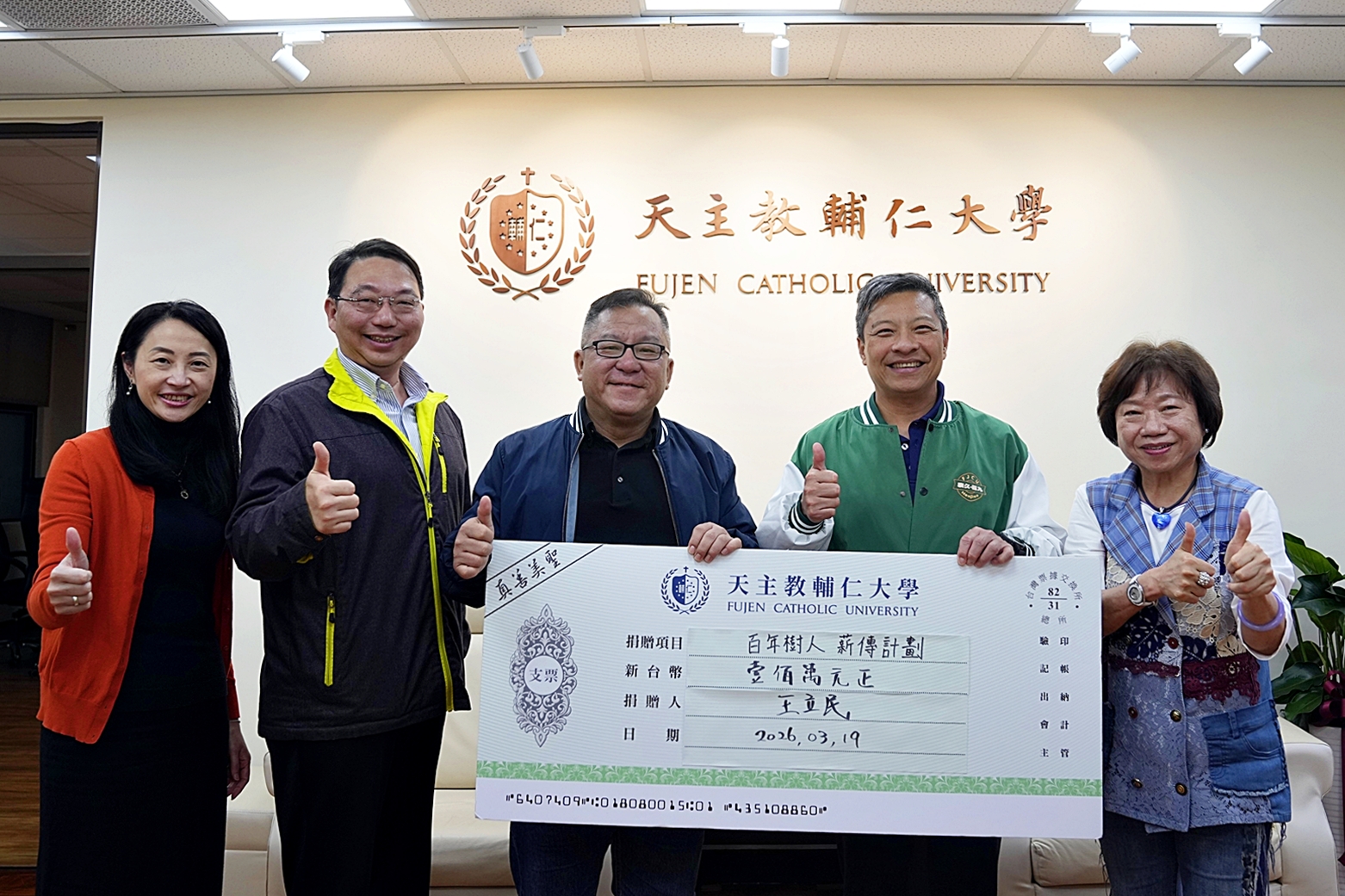 ▲立民學長響應藍校長推出的「百年樹人薪傳計畫」來支持企管系「全球供應鏈研究中心」,特別認養利瑪竇前的樹,在幫助母系的同時也能在校園的樹牌中留念。